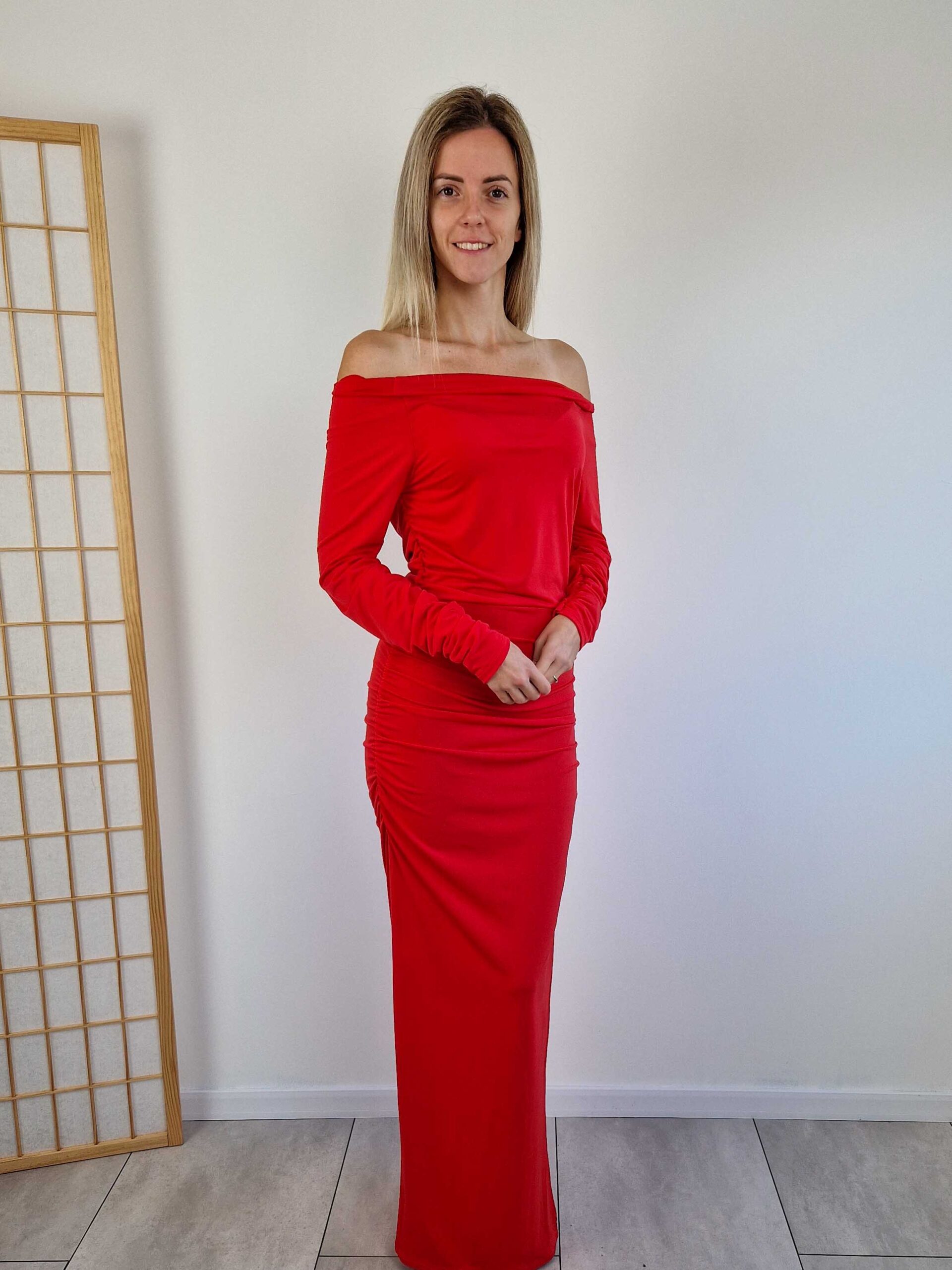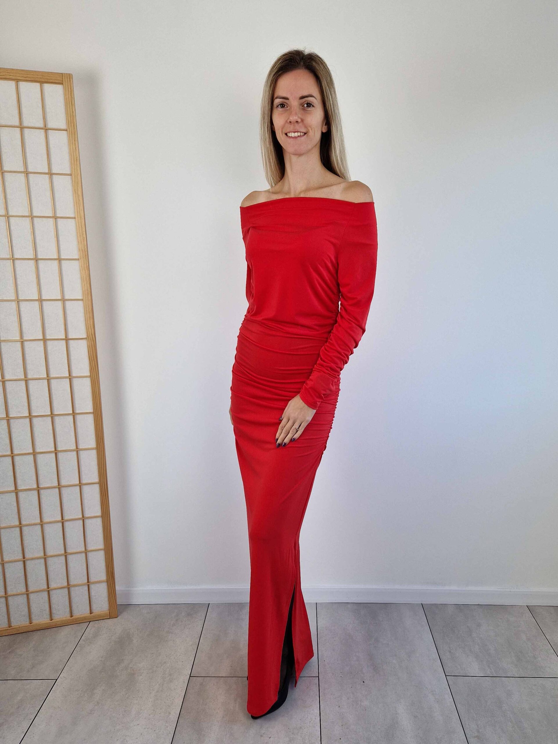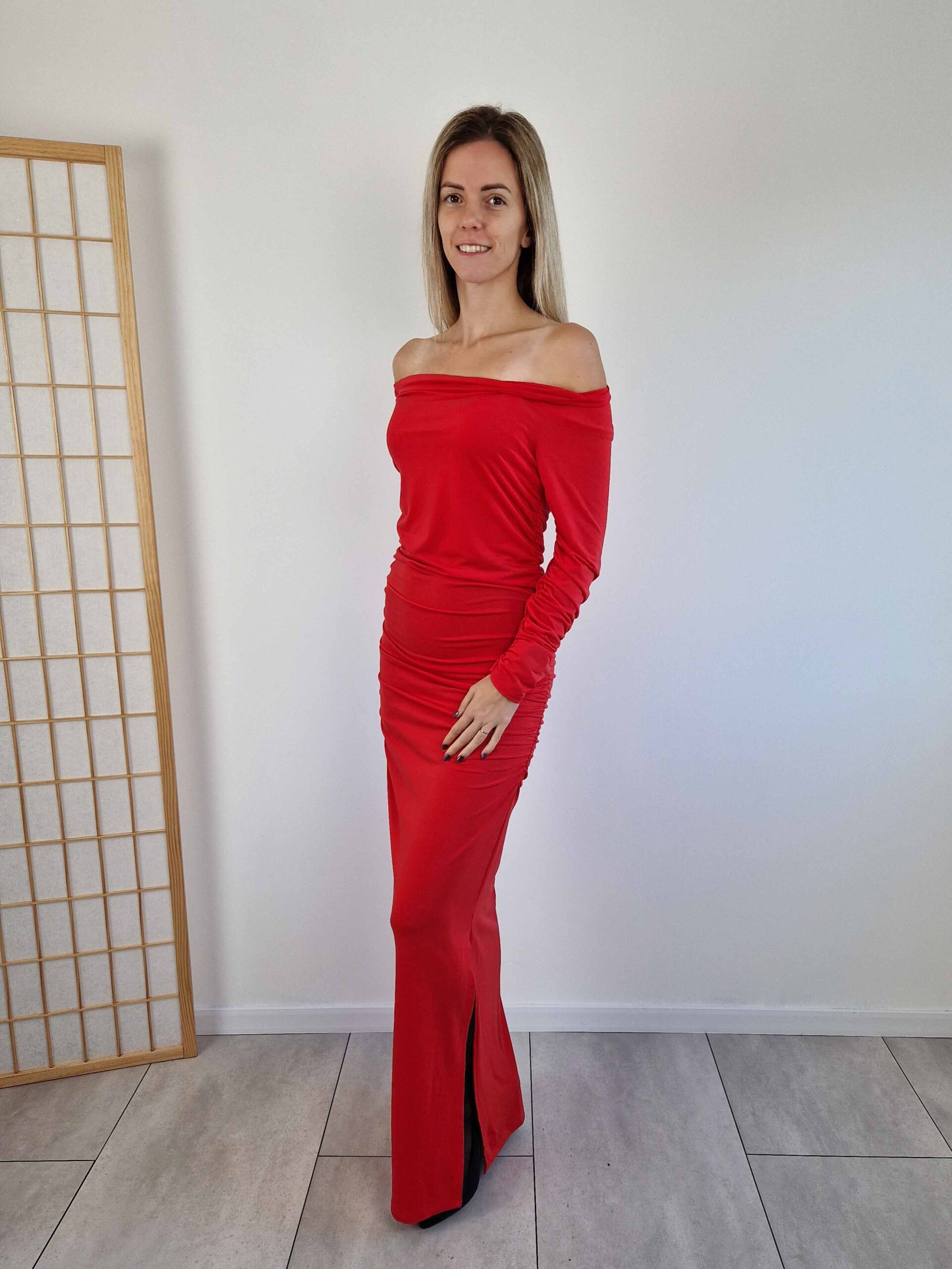 Piros alkalmi maxiruha lehúzható vállakkal