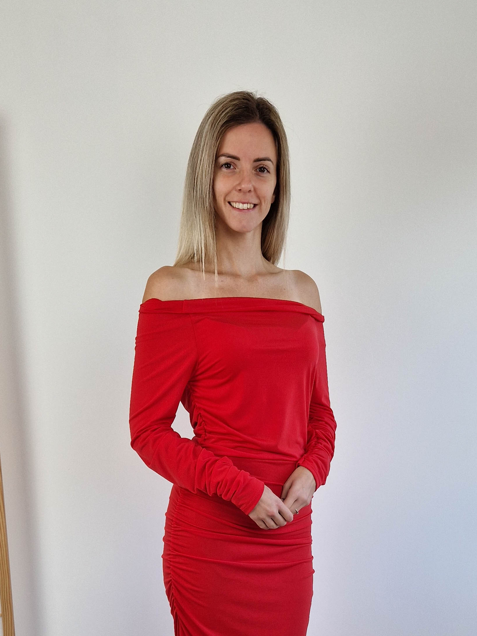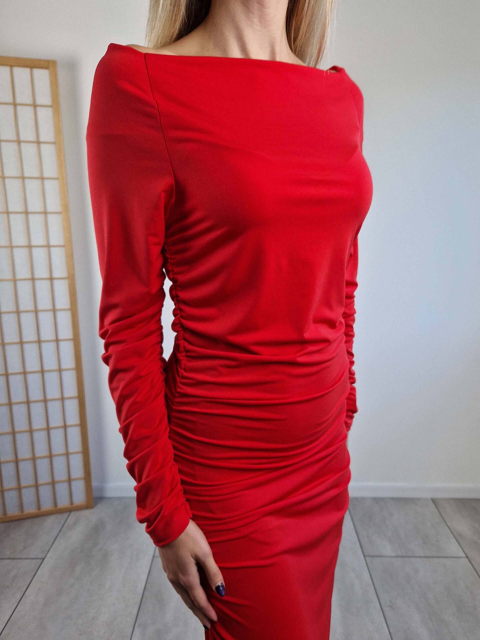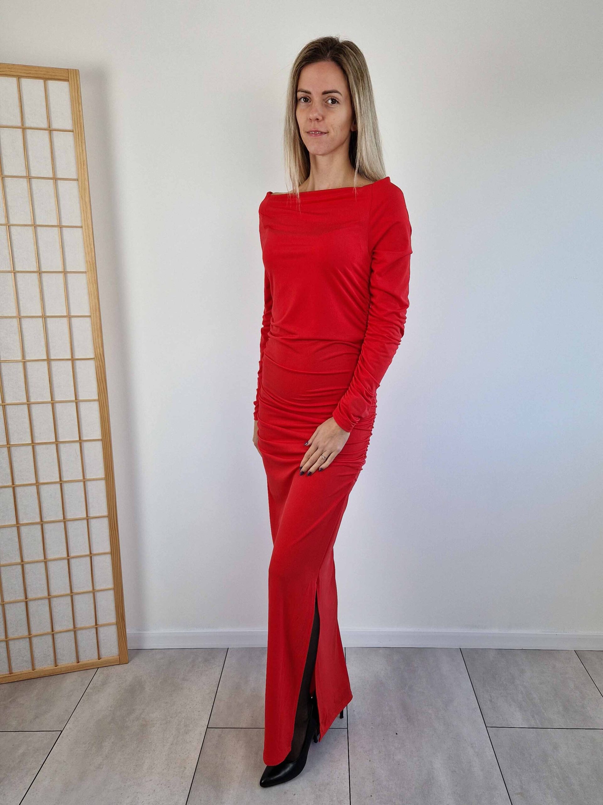 Piros alkalmi maxiruha lehúzható vállakkal