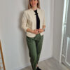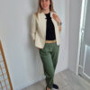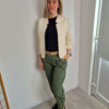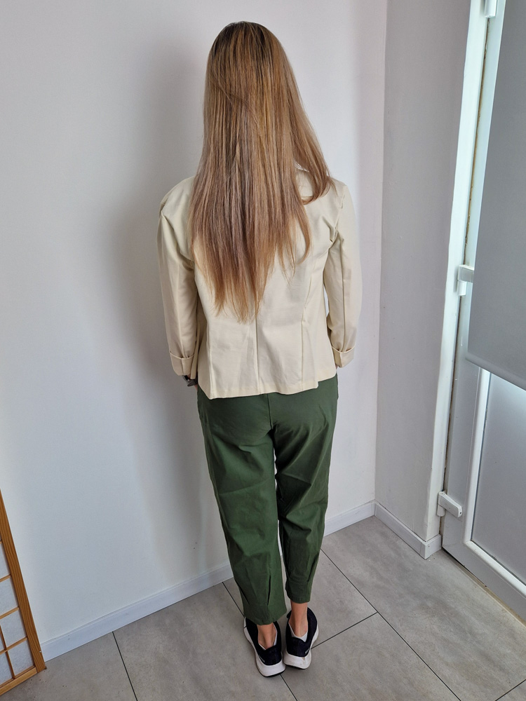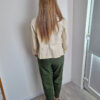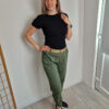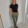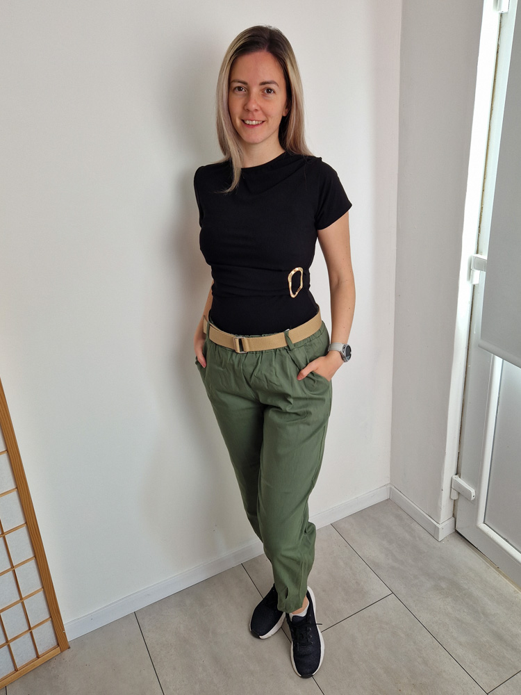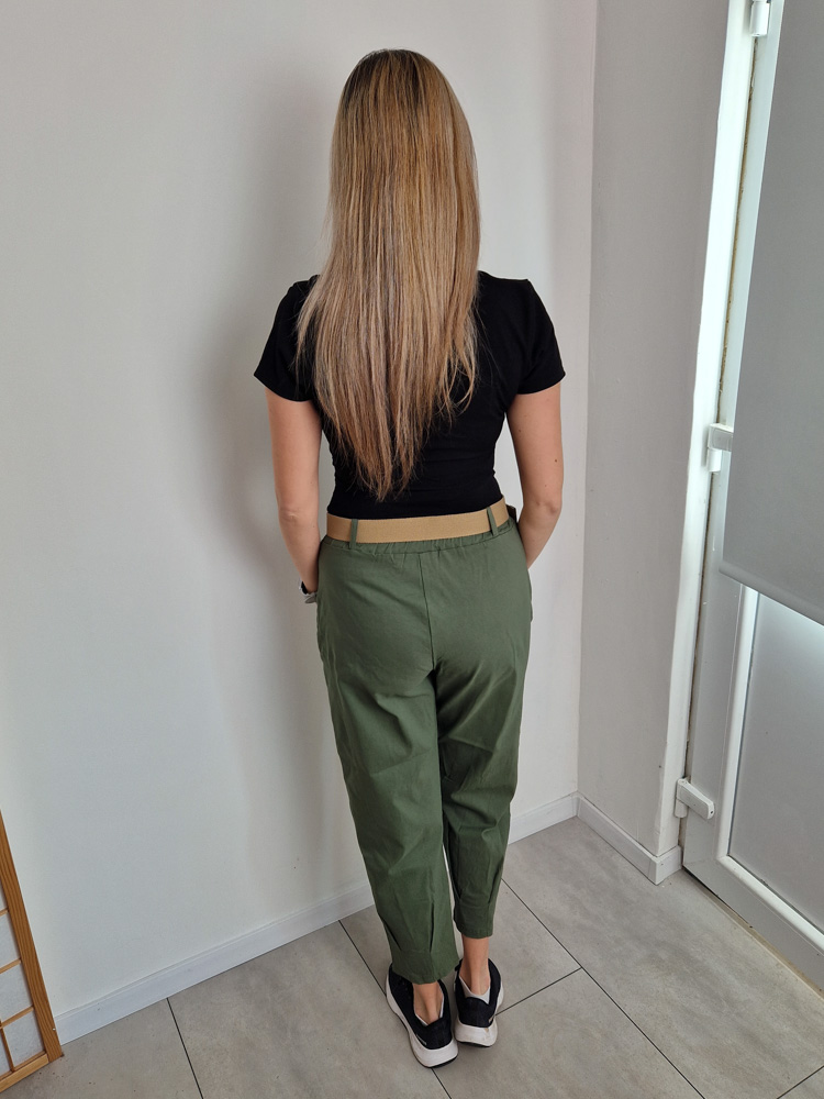 A magas derekú kialakítás szépen kiemeli a derekat, miközben a gumírozott derékrész maximális kényelmet biztosít. Nem szorít, nem vág be, egész nap komfortos viselet marad. Az ajándék, bézs öv harmonikusan illeszkedik a khaki árnyalathoz, és finoman hangsúlyozza az alakot.