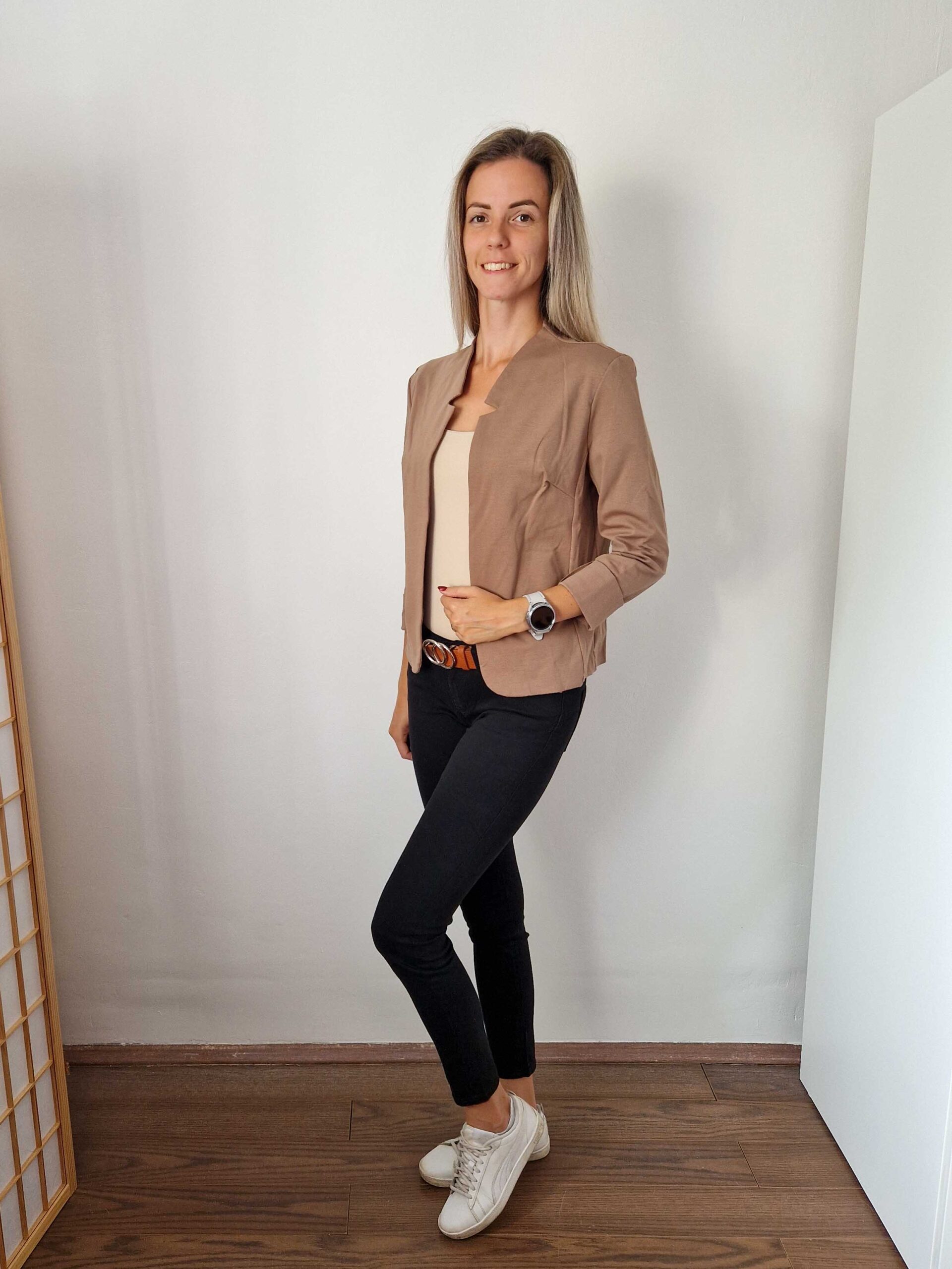 A letisztult, minőségi szabás lehetővé teszi, hogy egyszerűen kombinálhasd nadrággal vagy szoknyával