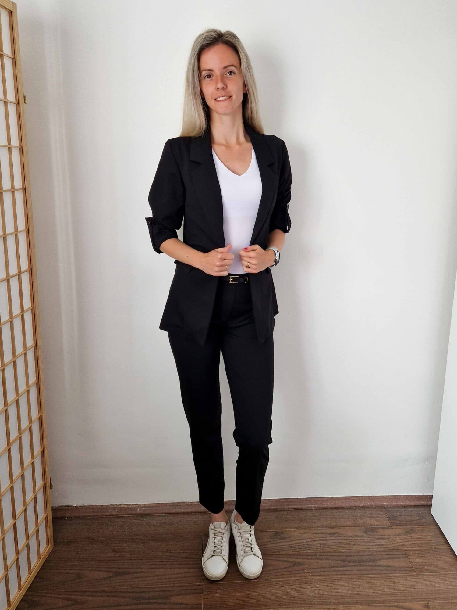 Női hosszabb fazonú fekete blézer felgombolható ujjakkal