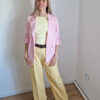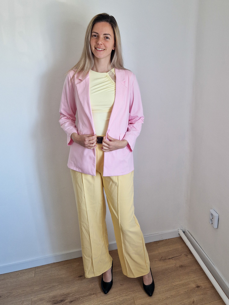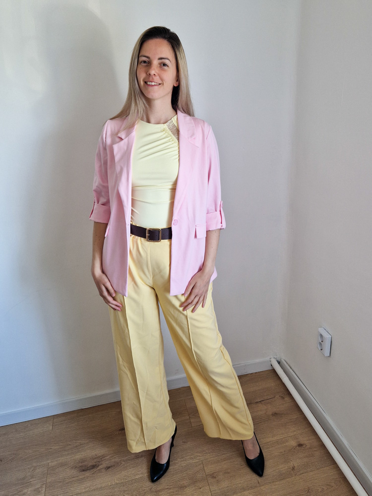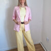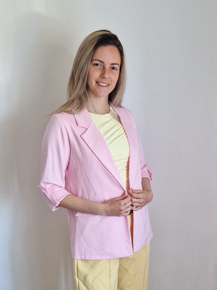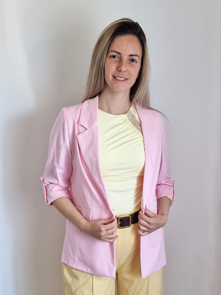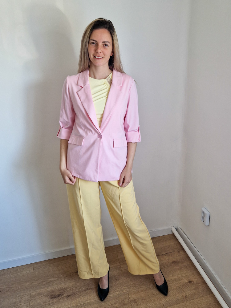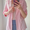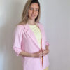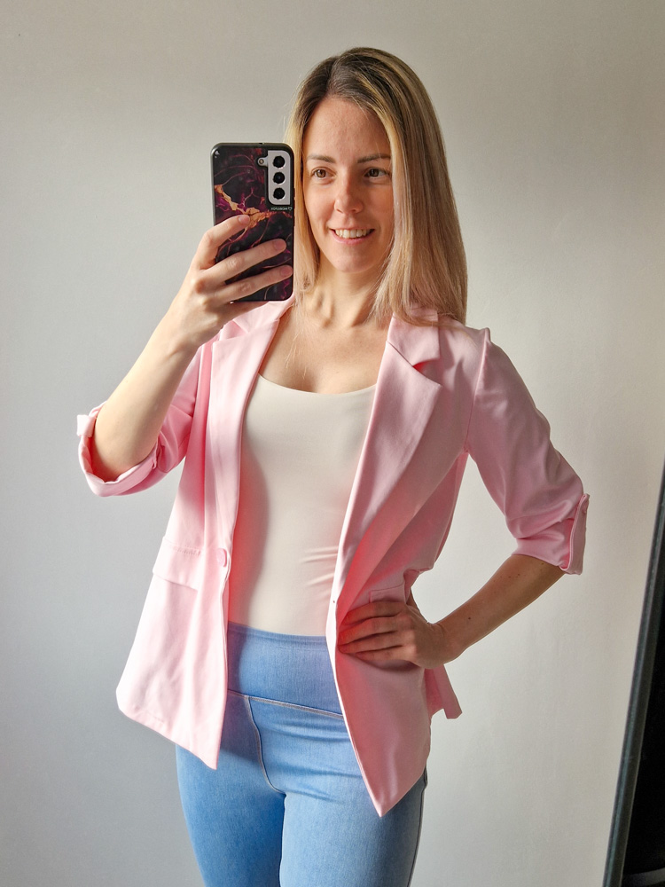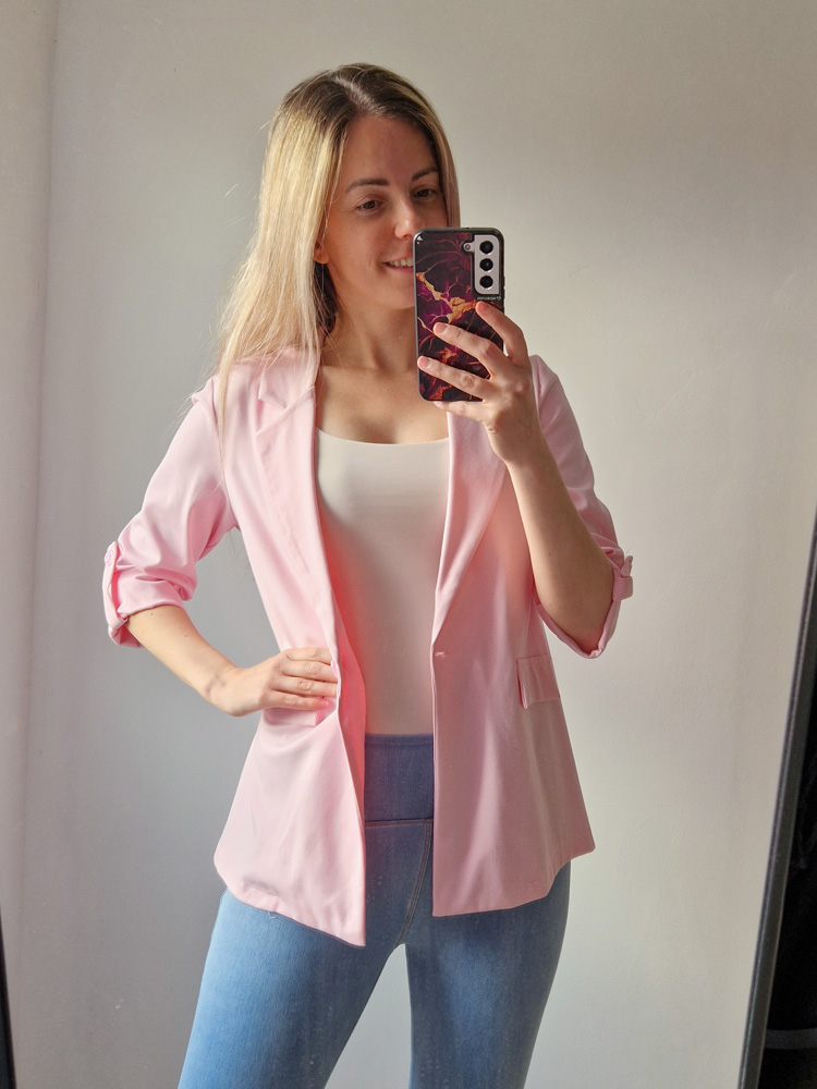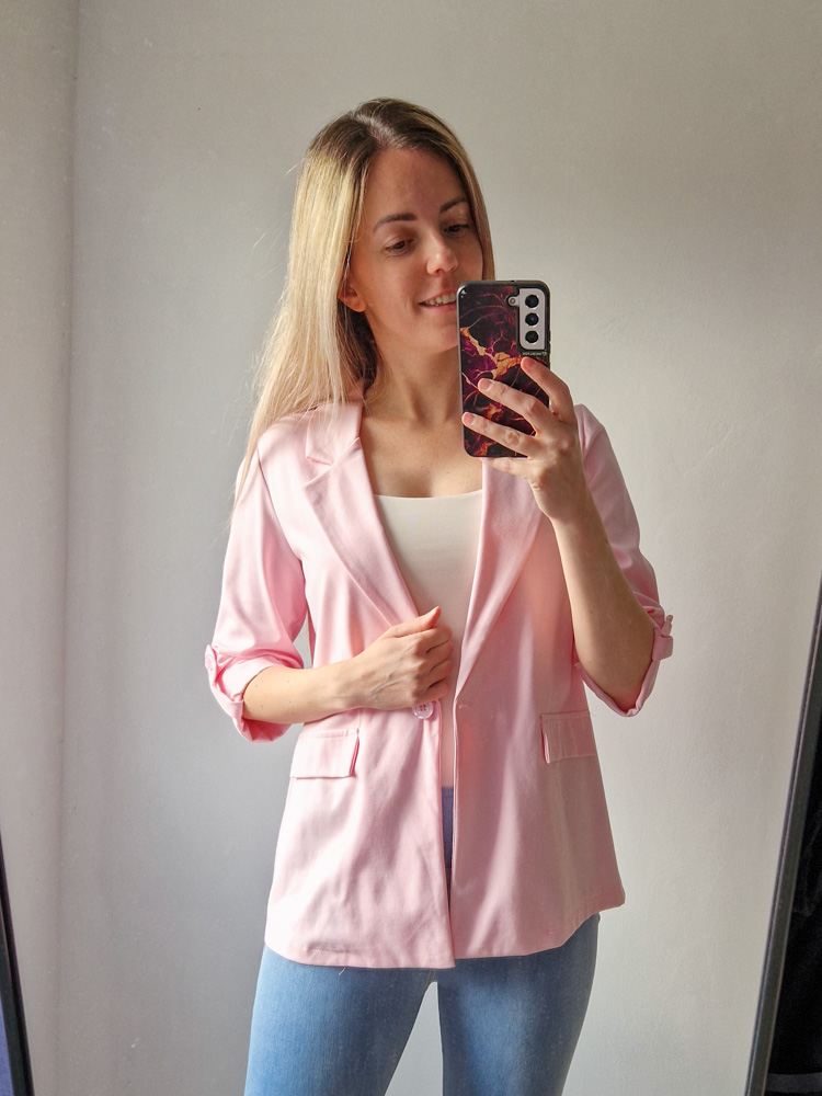 Női hosszabb fazonú rózsaszín blézer felgombolható ujjakkal