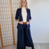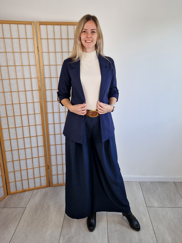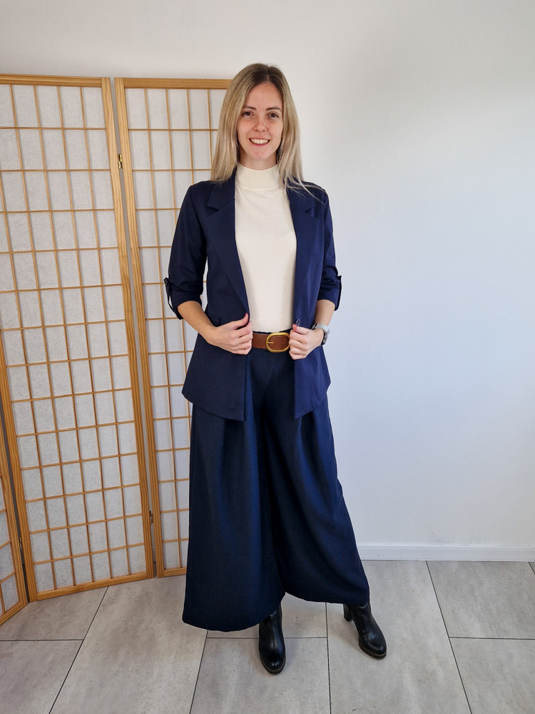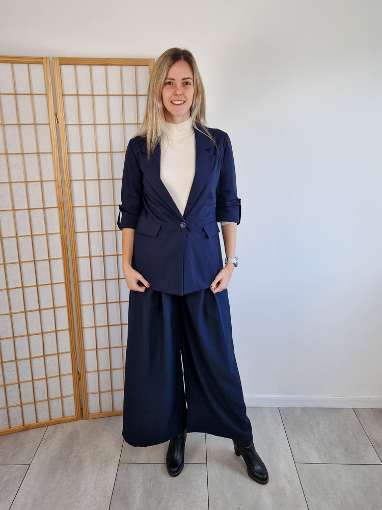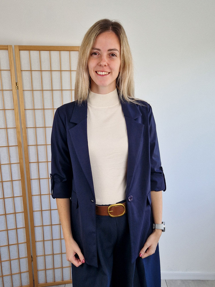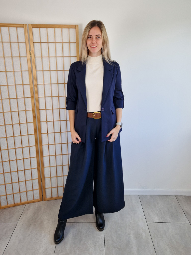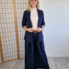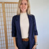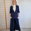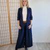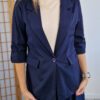 Női hosszabb fazonú sötétkék blézer felgombolható ujjakkal