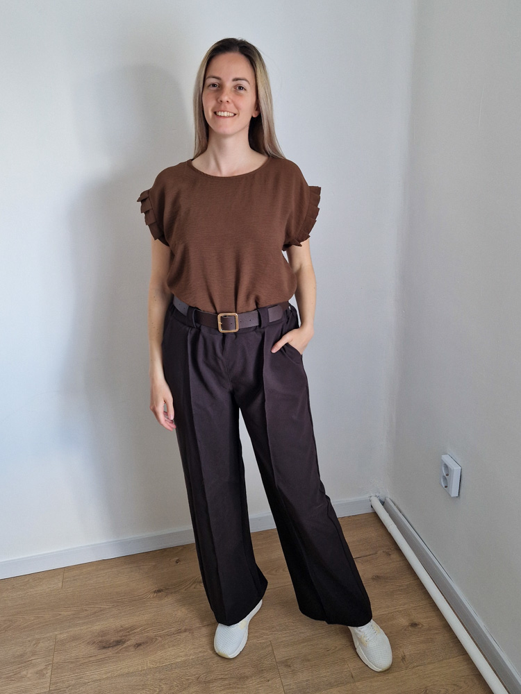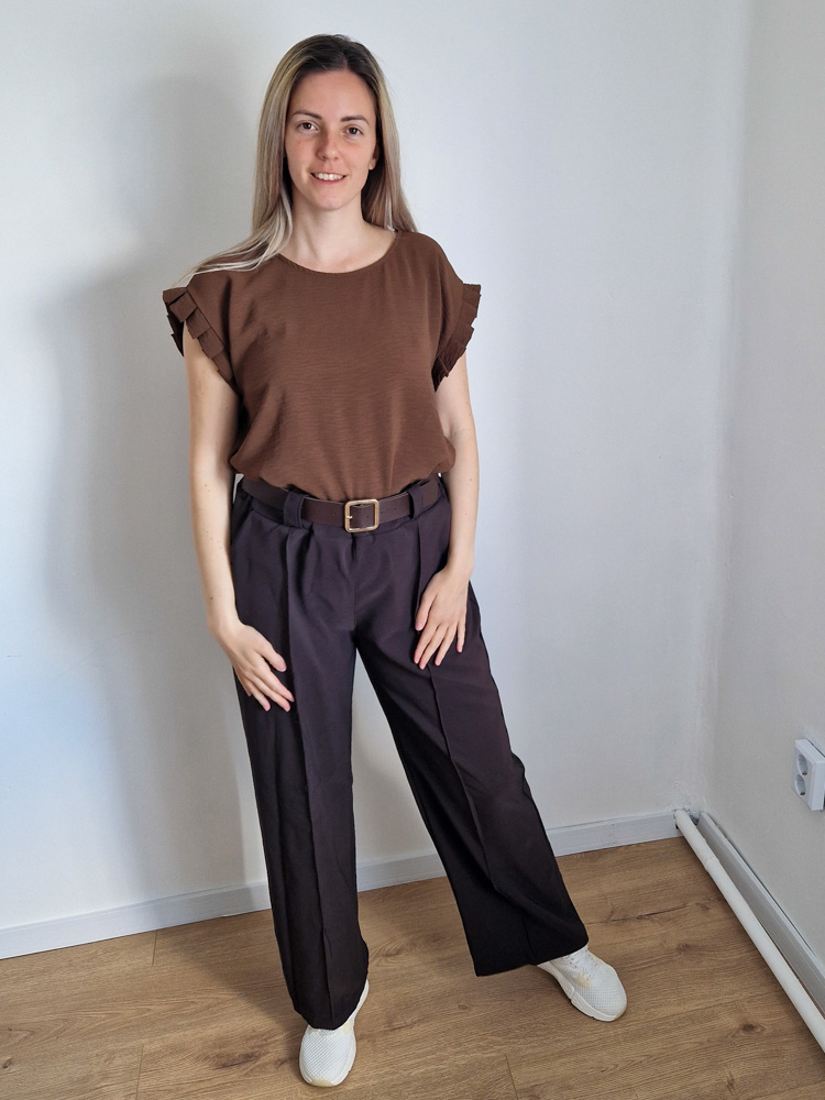 Ez a mély, csokibarna árnyalat melegséget és eleganciát sugároz – pont az a szín, ami azonnal “összerántja” a megjelenésedet. A finoman fodrozott ujjrész nőies részletet ad hozzá, miközben az összhatás végig letisztult és harmonikus marad.