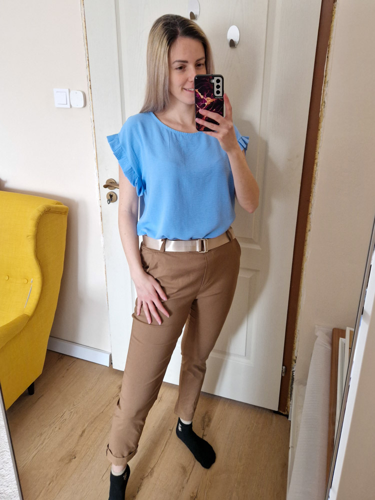 – Hétköznapokon: világos felsővel és lapos cipővel letisztult, nyugodt outfit