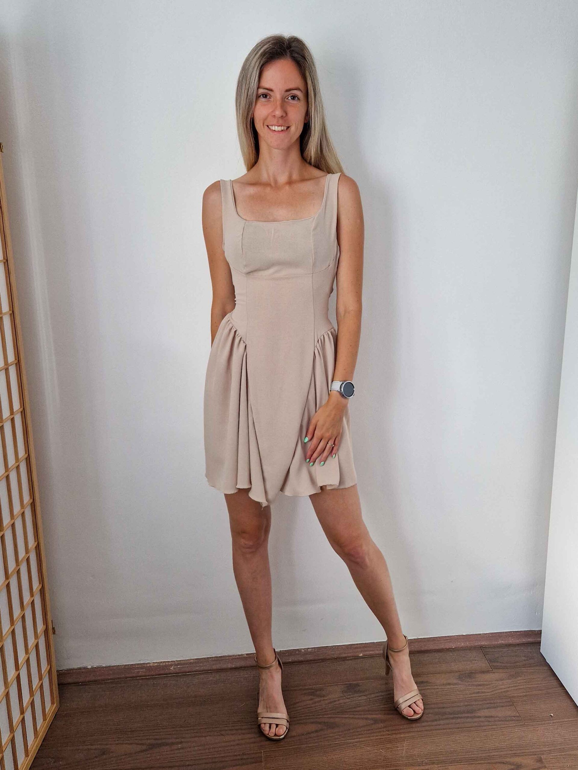 Bézs színű dekoltált, különleges szabású, hátul masnira kötős ruha alacsony lányoknak