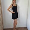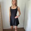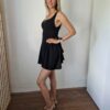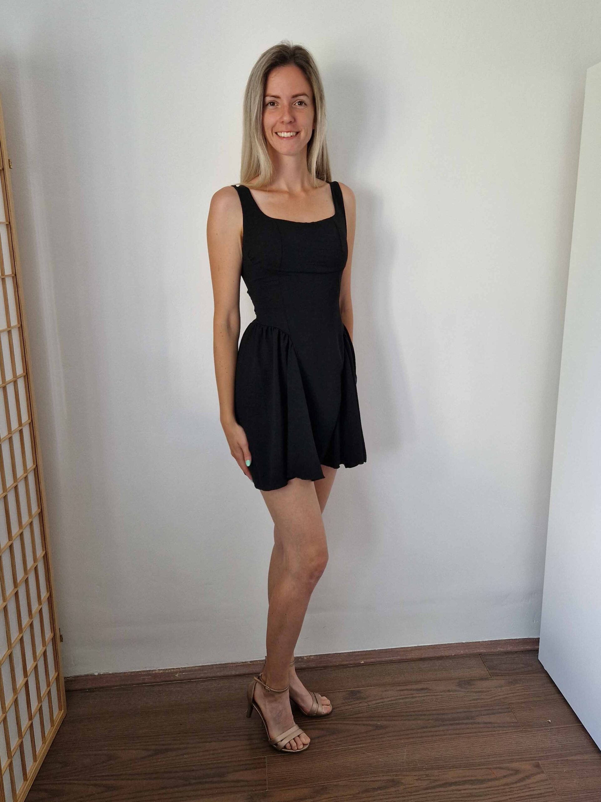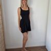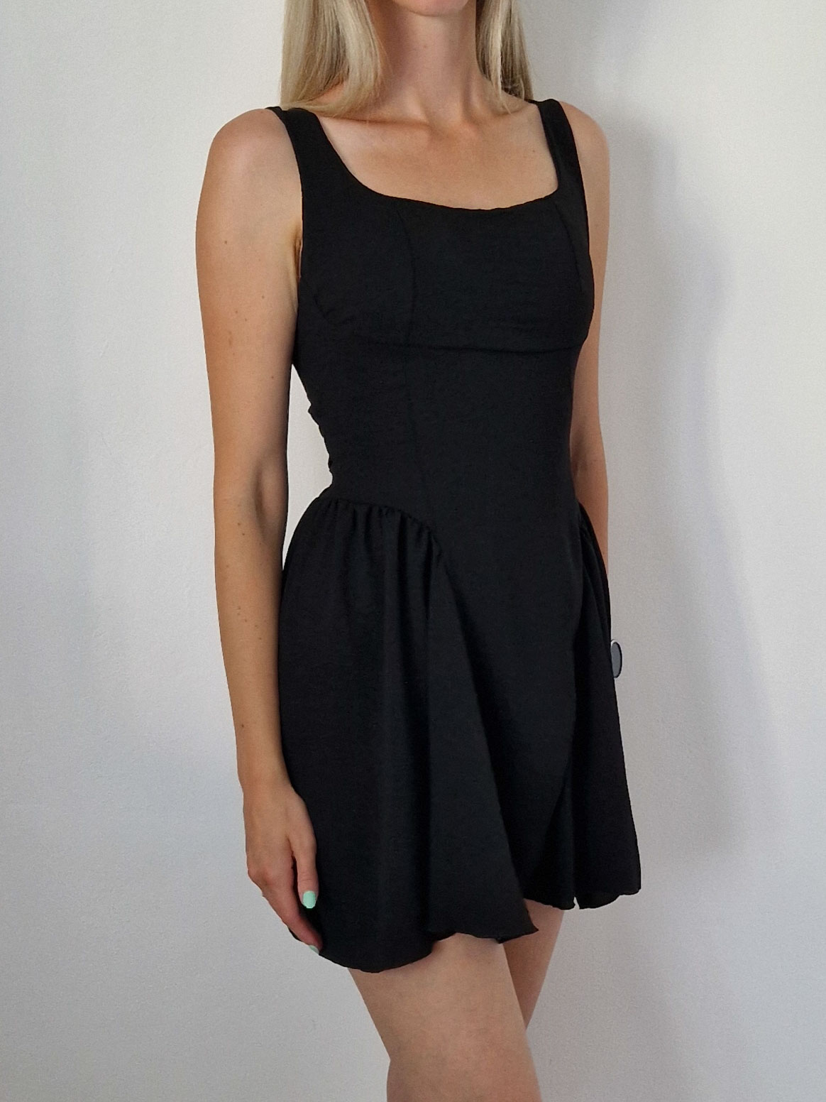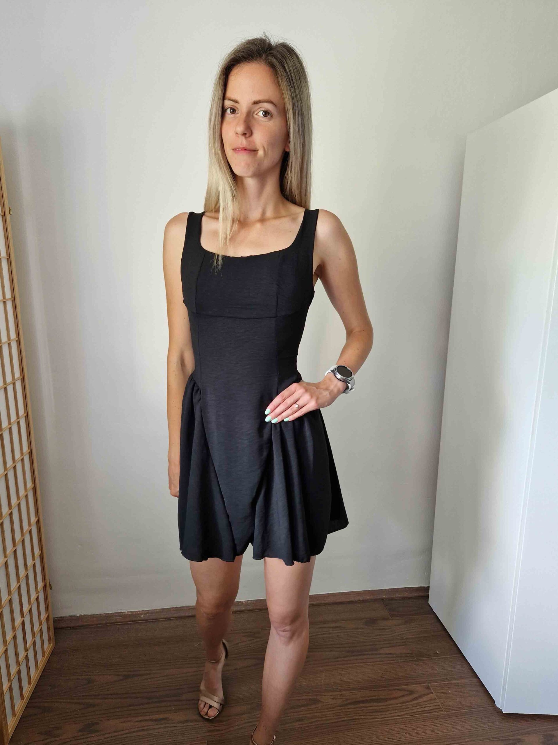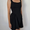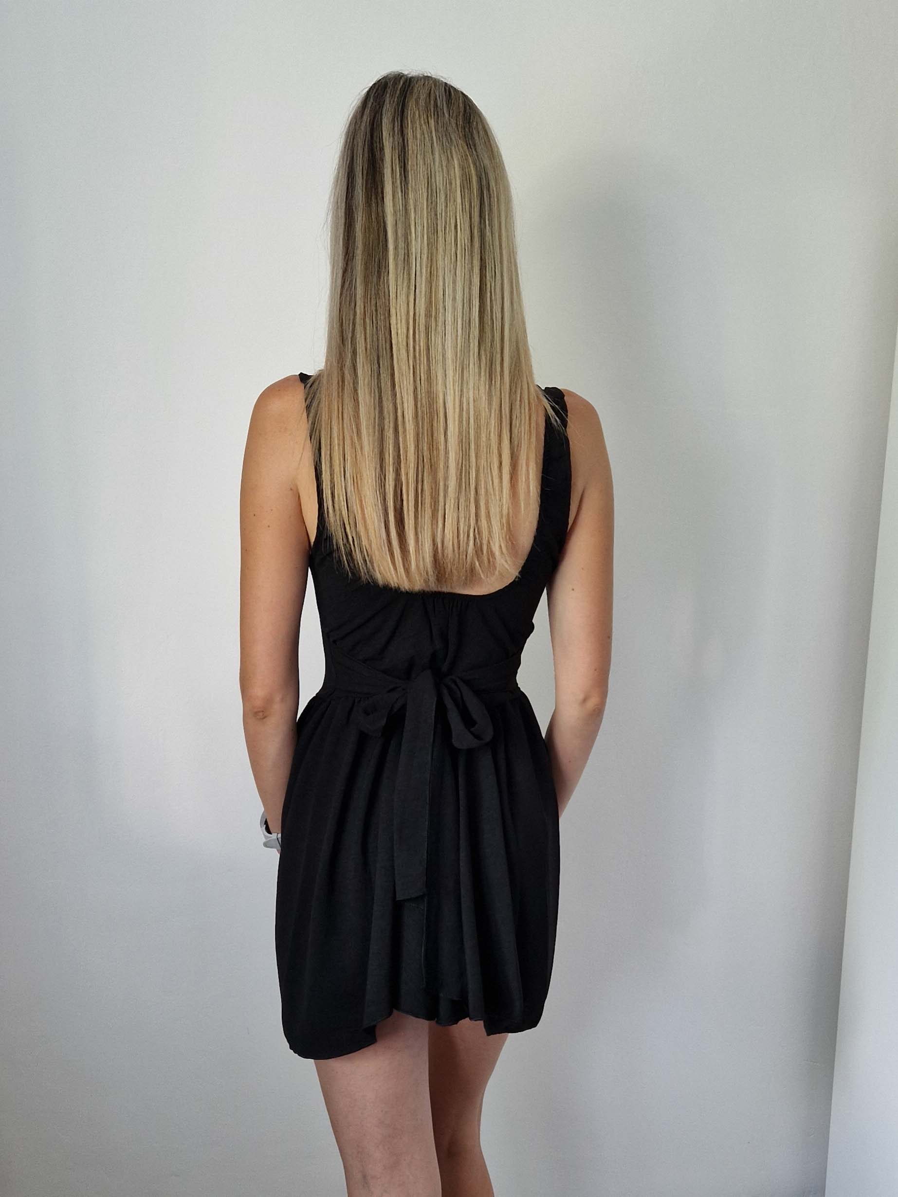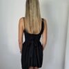 Fekete színű dekoltált, különleges szabású, hátul masnira kötős ruha alacsony lányoknak