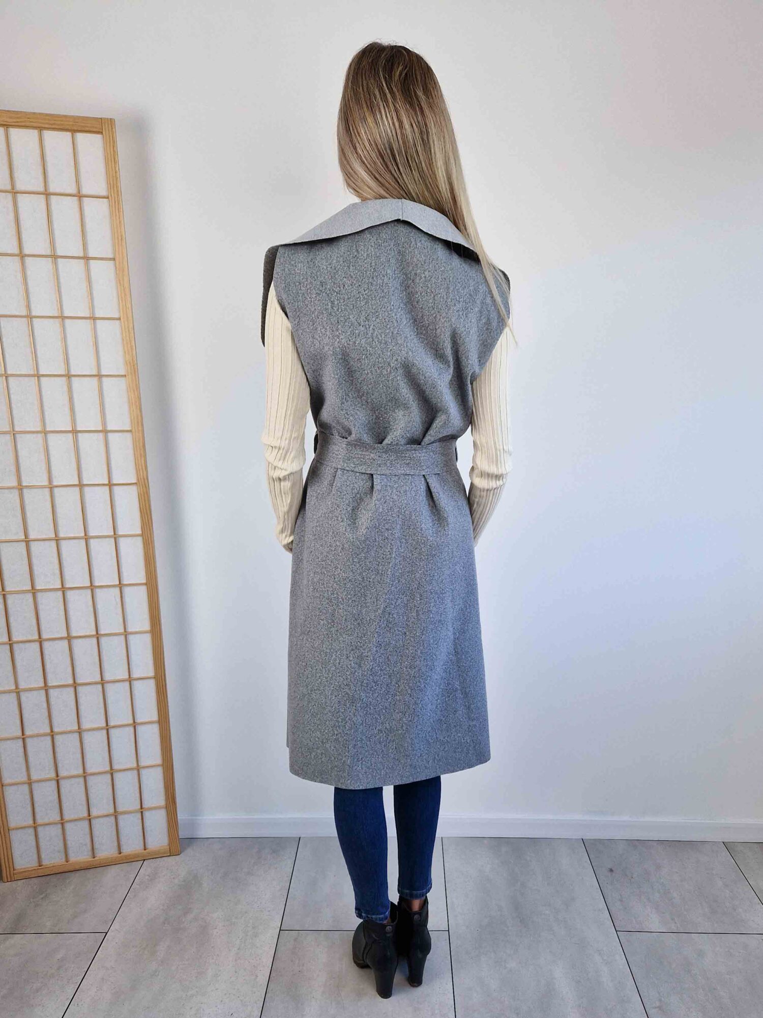 Szürke filc mellény, ami kihagyhatatlan a hűvösebb időjárásban. Jelenleg zseb nélküli, hosszabb fazonban.