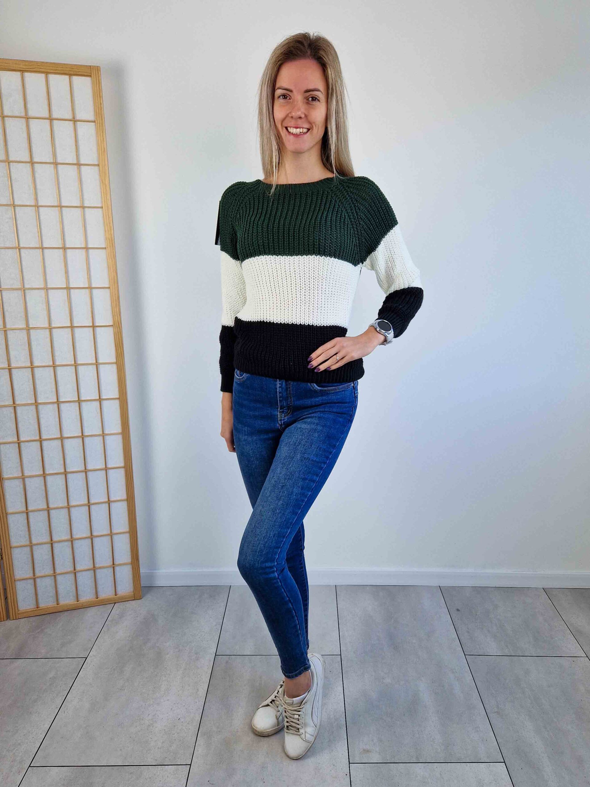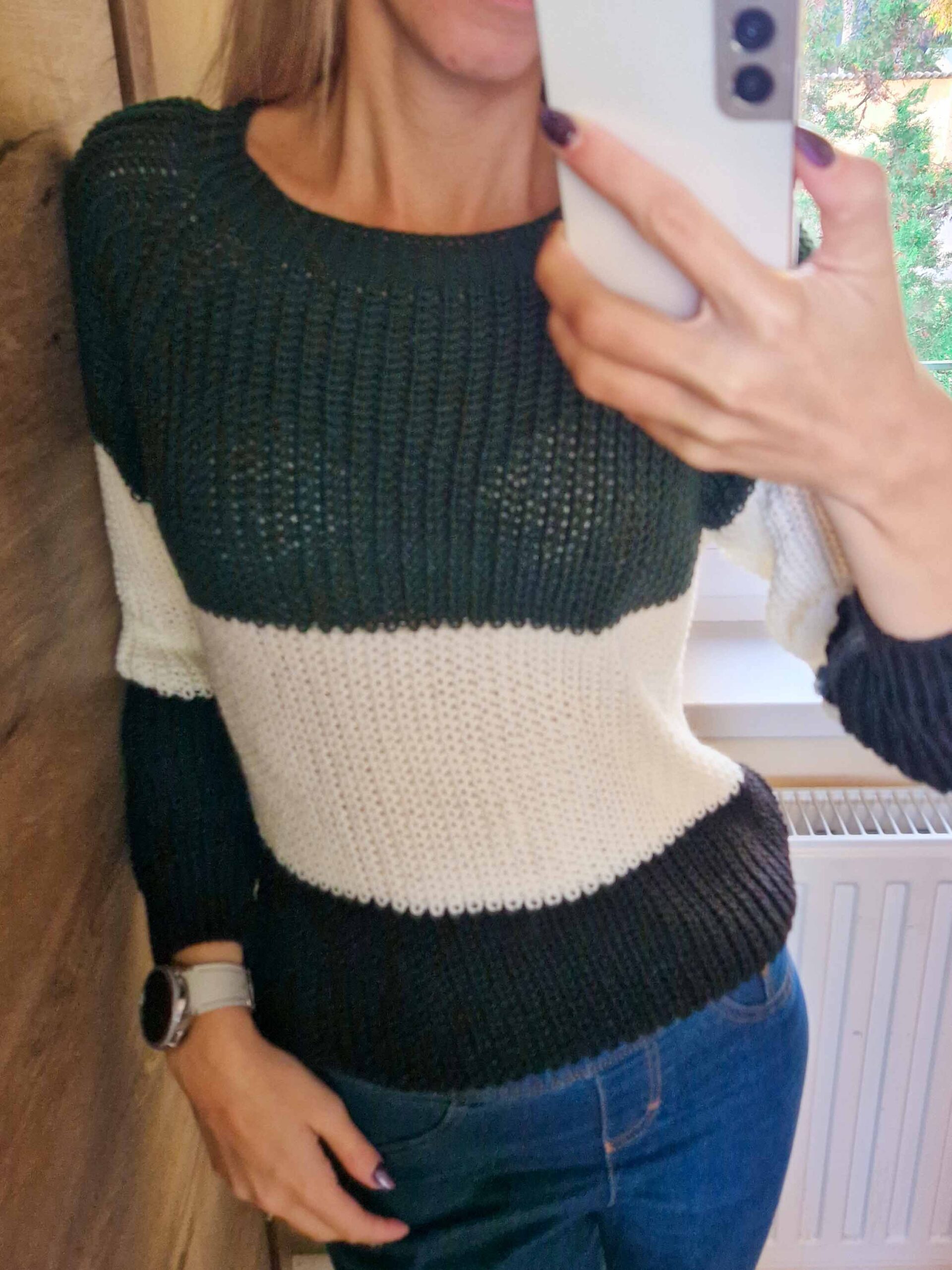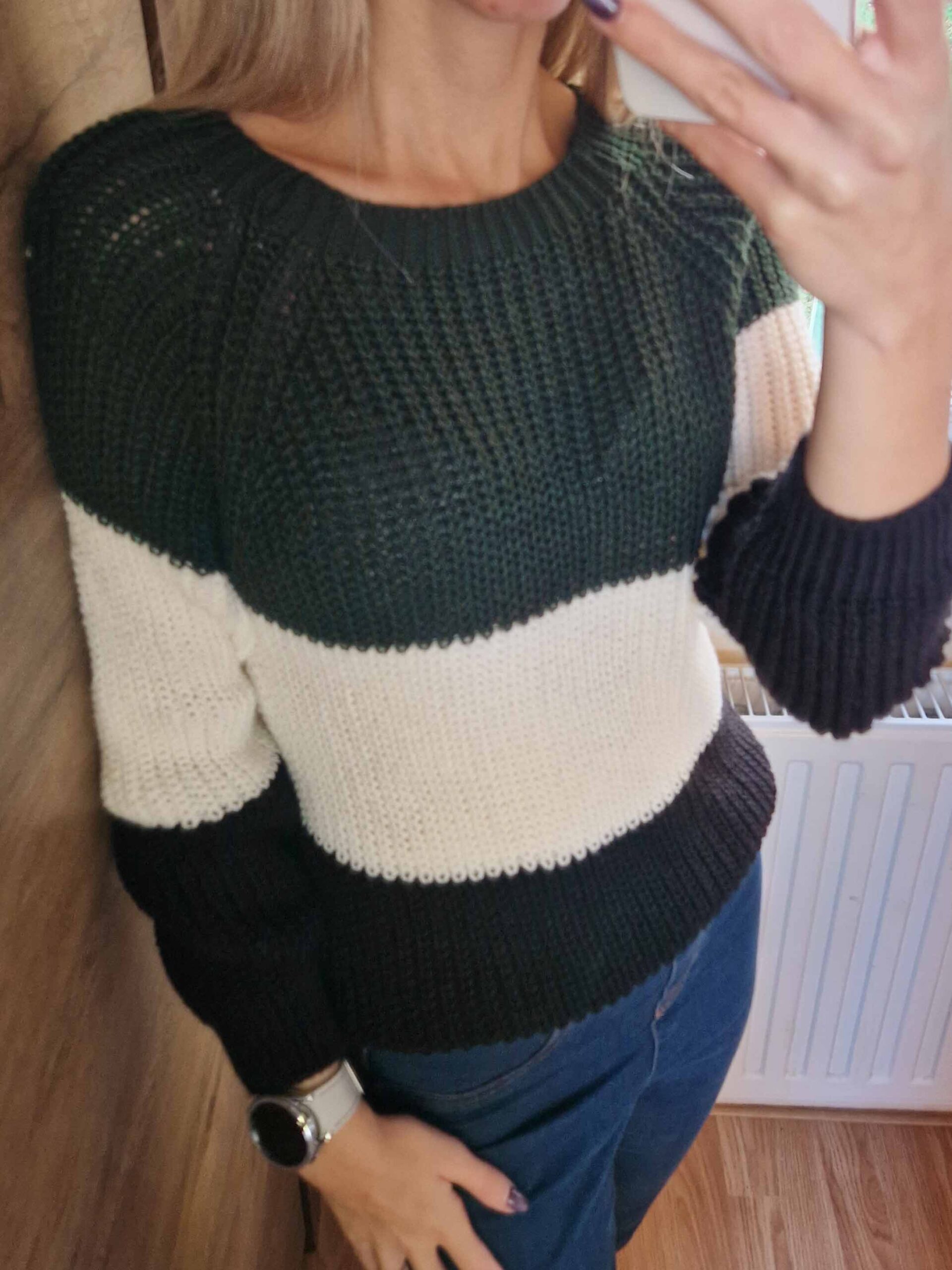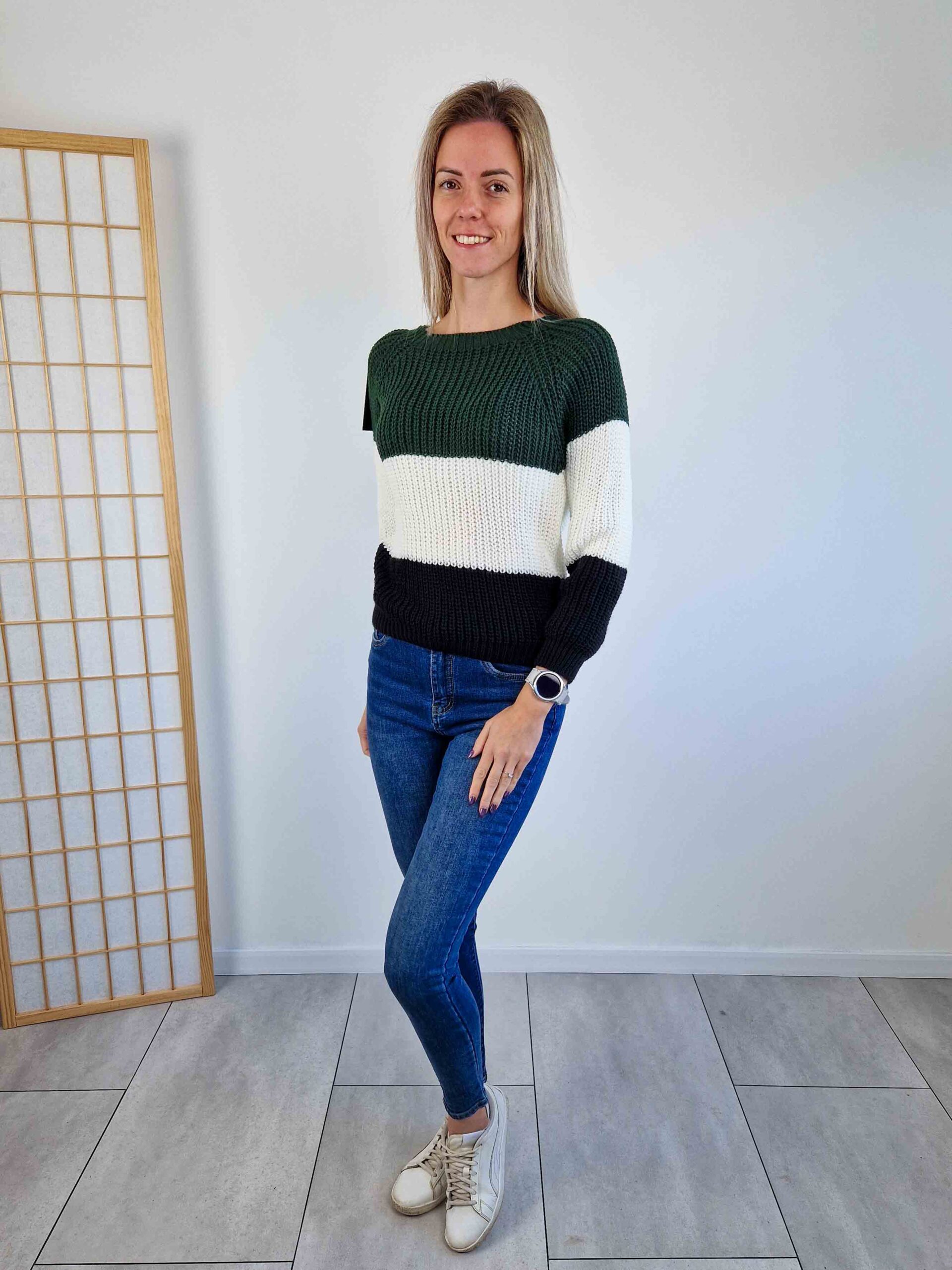 Sötétzöld-fehér-fekete csíkos kötött pulóver
