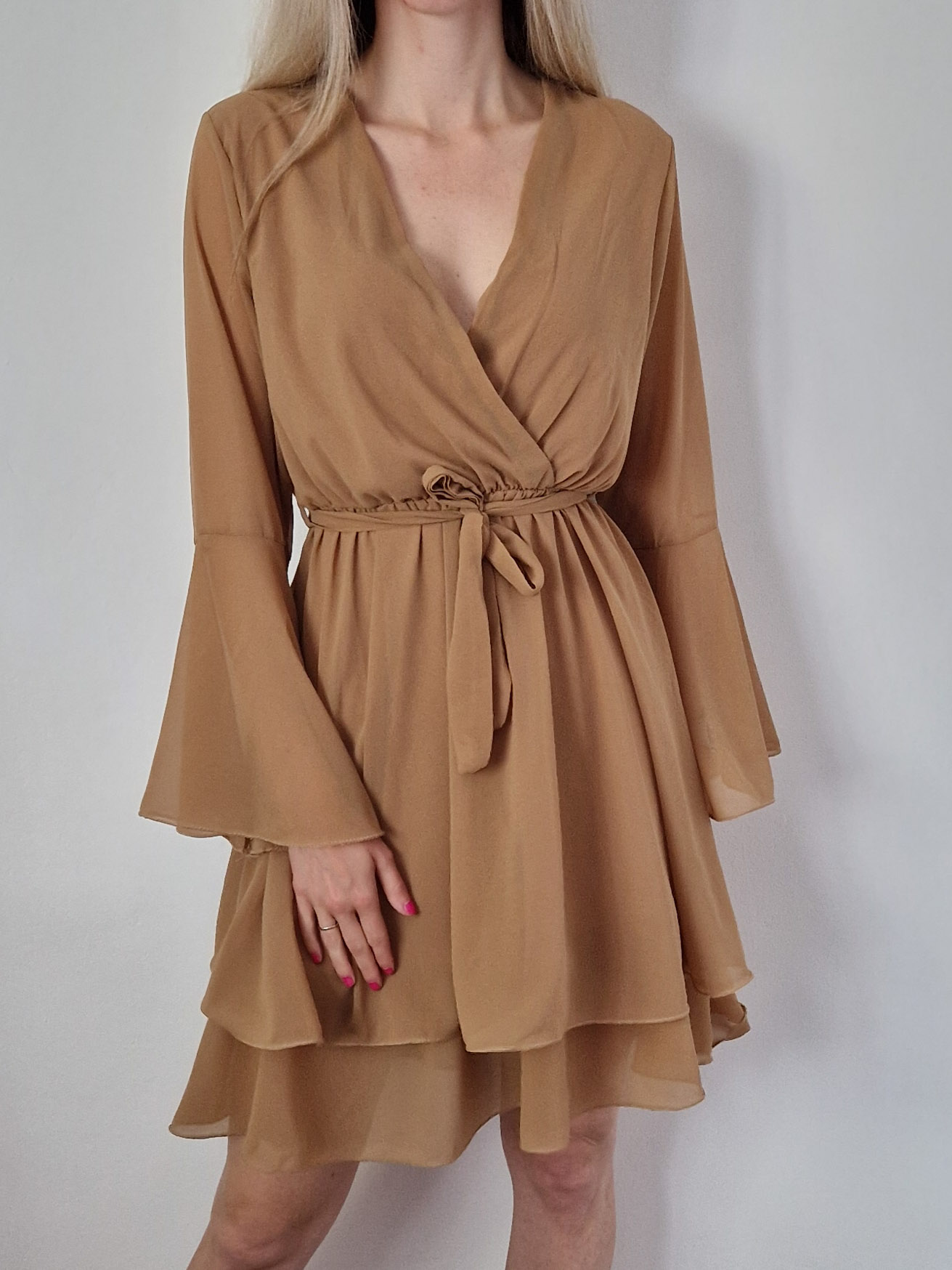 A légies chiffon réteg lágyan követi a mozdulataidat, a dupla loknis szoknya minden lépésnél finoman hullámzik, a harangujjak pedig különleges, nőies karaktert adnak.