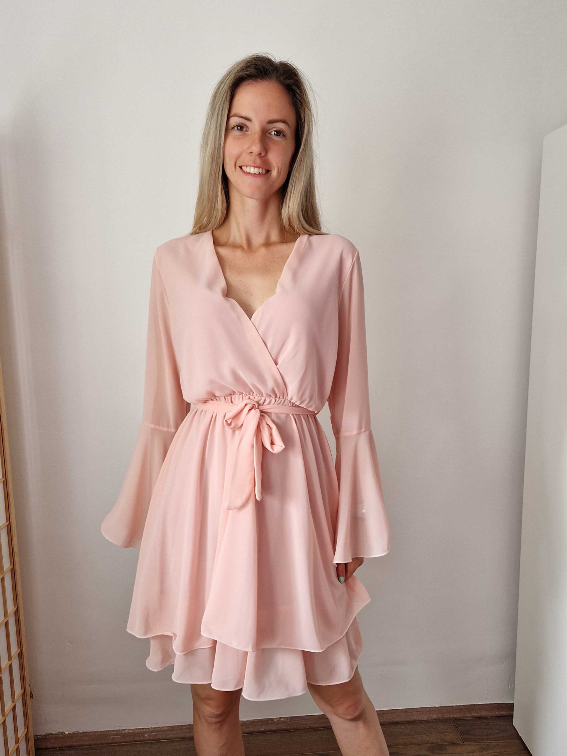 Sogno Selyem Rózsa púder harangujjú loknis chiffon alkalmi ruha