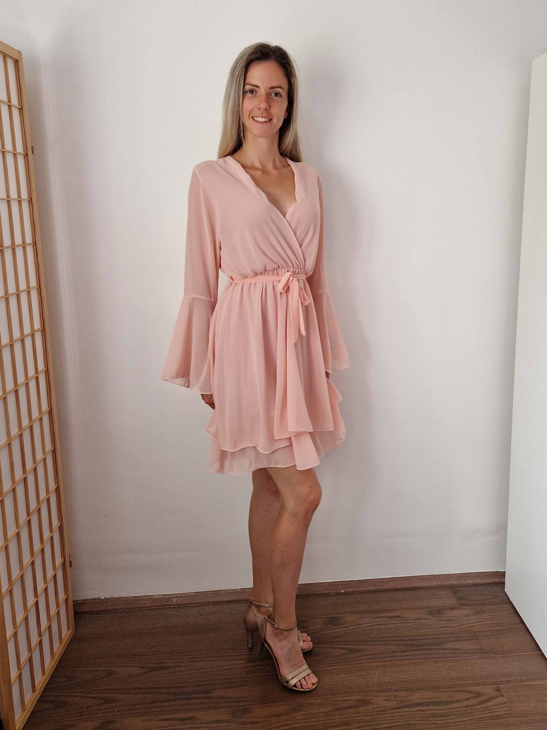 Púder rózsaszín harangujjú loknis alkalmi ruha