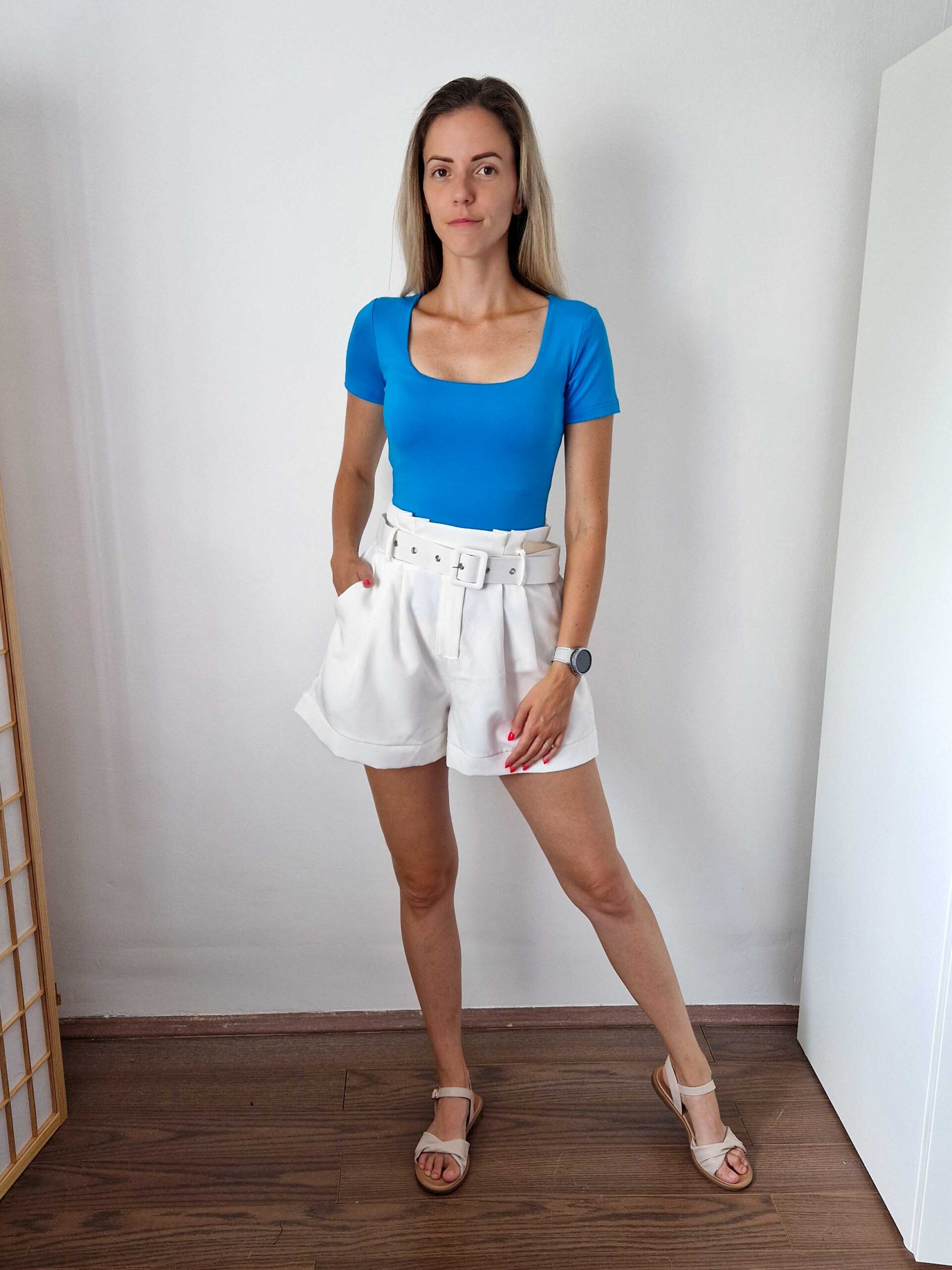 Aqua kék push-up hatású kerek nyakú dekoltált rövidujjú felső