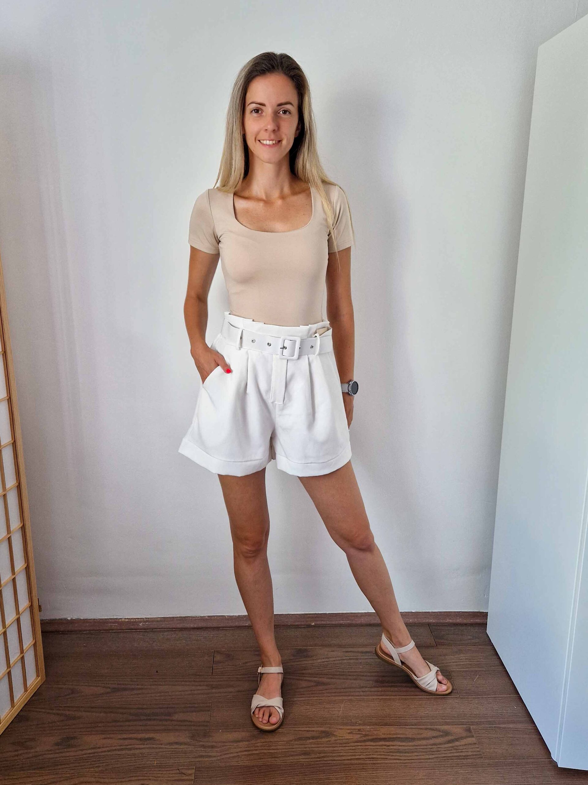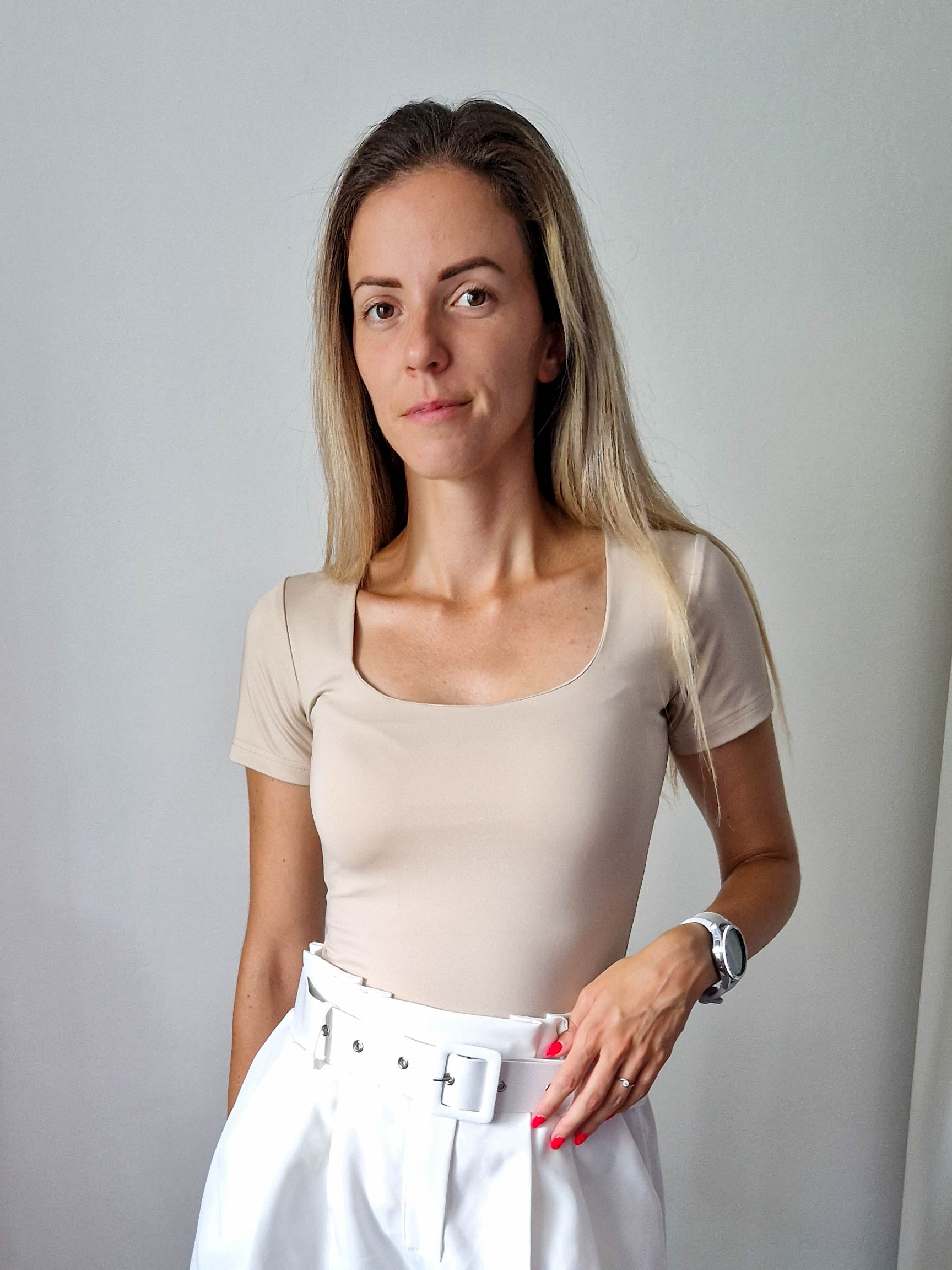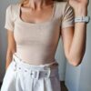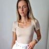 Bézs push-up hatású kerek nyakú dekoltált rövidujjú felső